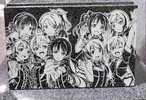 Mới đây, người dùng Twitter Hide đã chia sẻ về một tấm bia kì lạ tại nơi làm việc của anh. Hình khắc trên đá là nhóm thần tượng μ’s từ anime Love Live!. Trên phiến đá được chạm trổ để tưởng niệm người chết là các cô gái của μ’s đứng bên nhau với vẻ mặt hạnh phúc. Tấm bia được tô điểm bằng nhiều trái tim trang trí trên mặt bệ nhỏ hơn.
